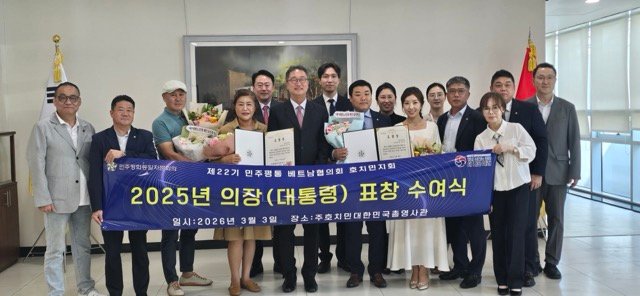 민주평통 베트남협의회 호치민지회 (회장 황인호)는 2026년 3월 3일 주호치민총영사관에서 2025년 평화공존 활동와 민주평통 발전에 기여한 유공자에 대한 민주평통 의장(대통령)표창 수여식을 개최하였다.