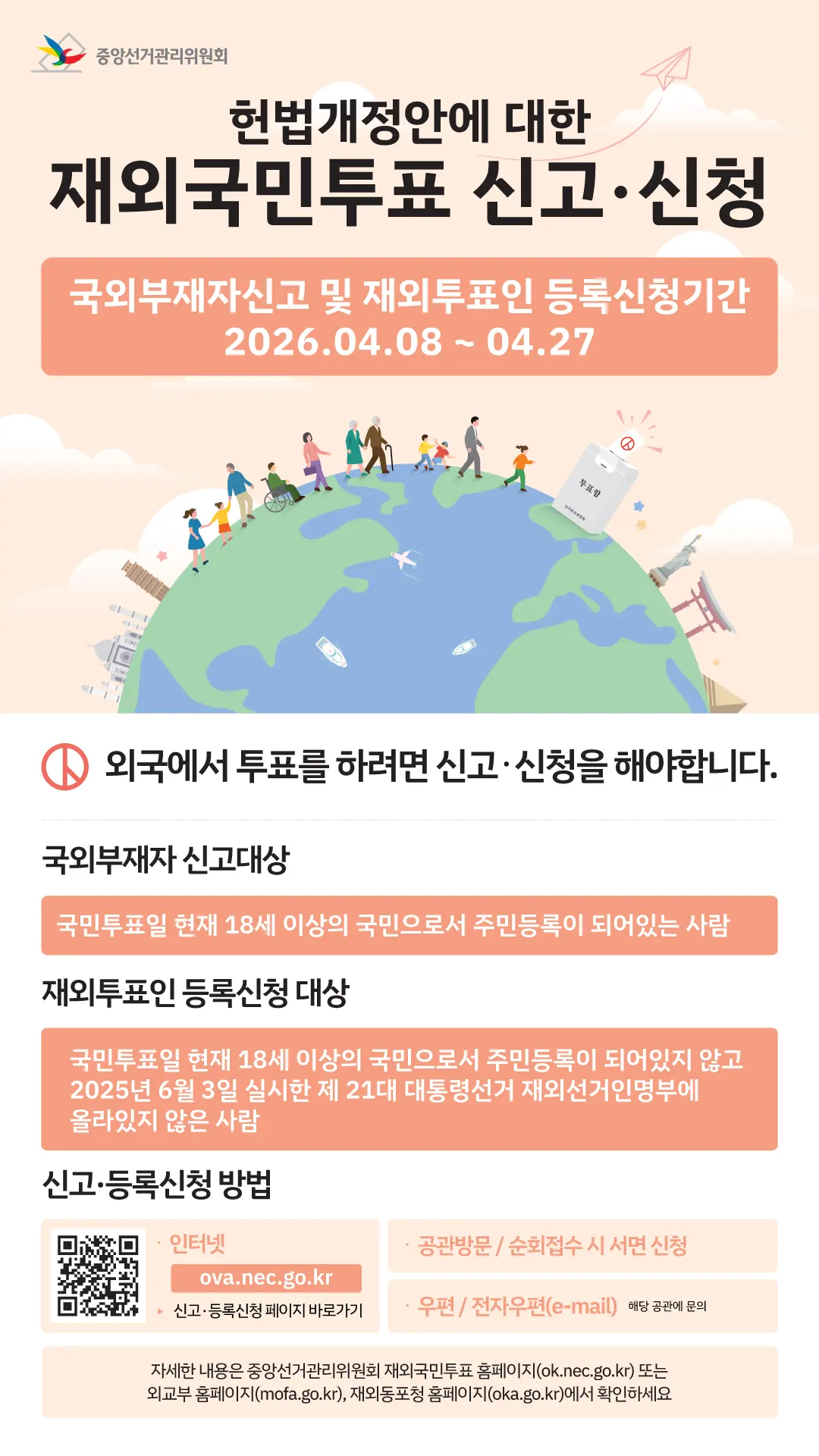 「국민투표법」 제53조 및 「공직선거법」 제218조의4에 의거하여, 외국에서 투표하고자 하는 선거권자는 매 선거 시마다 반드시 국외부재자 신고를 하여야 함을 알려드립니다.